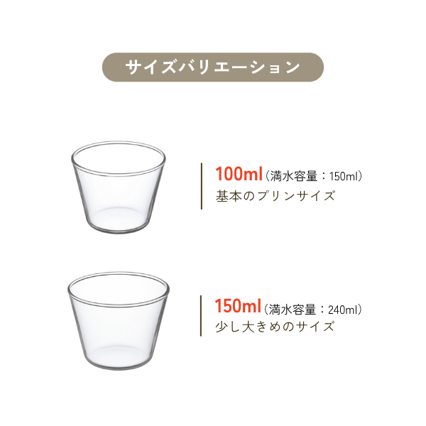 JANコード 4905284090104 素材 耐熱ガラス 寸法 φ8.6×H6.5cm 原産国 タイ 容量 150ml(実用容量) / 240ml(満水容量) カテゴリー クックウェア >> プリンカップ 取り扱いについての注意 耐熱ガラスは熱に強いガラスであり、衝撃に強い強化ガラスとは異なりますので、丁寧にお取扱いください。 詳細はこちら