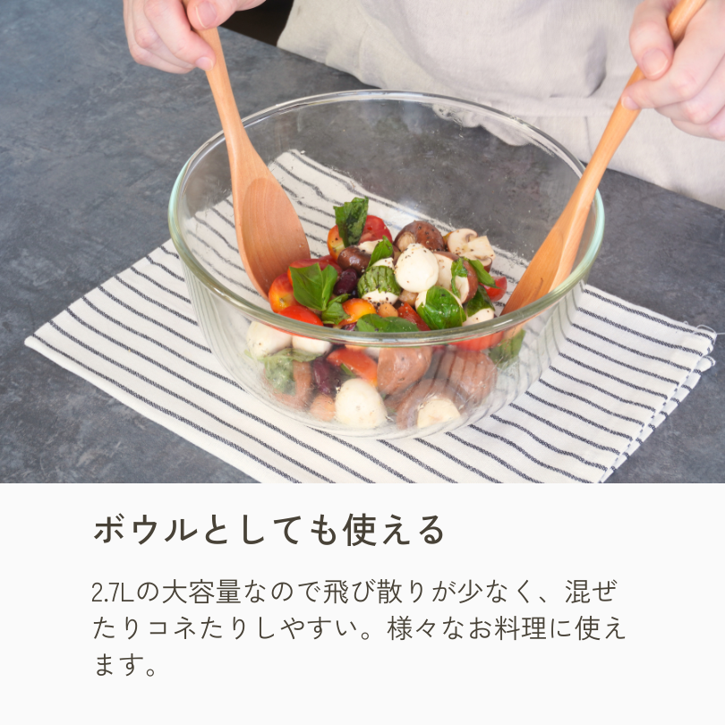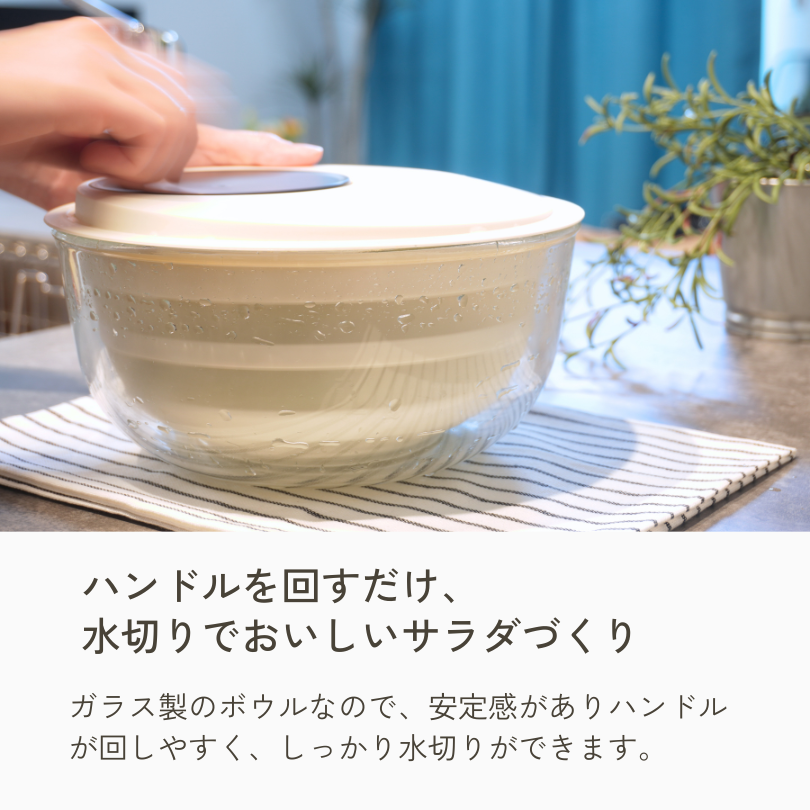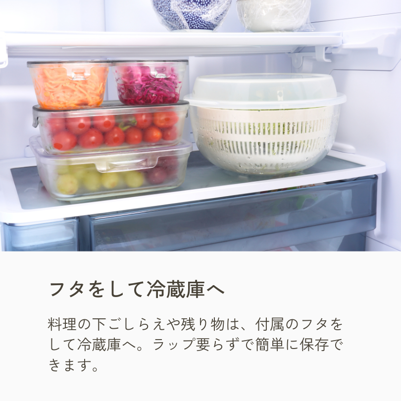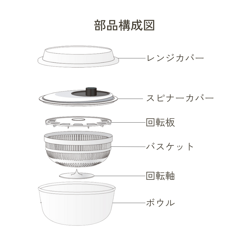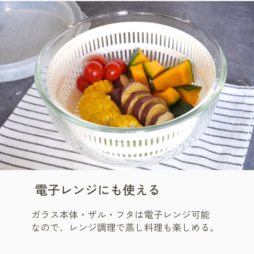 | 素材 | ボウル/耐熱ガラス レンジカバー/ポリプロピレン(耐熱温度:140℃) スピナーカバー/ポリプロピレン(耐熱温度:120℃) エラストマー(ハンドル部)(耐熱温度:100℃) 回転板/ポリプロピレン(耐熱温度:120℃) バスケット/ポリプロピレン(耐熱温度:140℃) 回転軸/ポリプロピレン(耐熱温度:120℃)  |