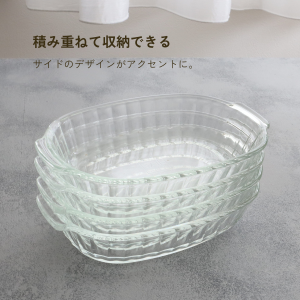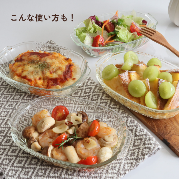 グラタン以外のメニューにも使いやすい。サイドのガラスのデザインがアクセントに。スイーツやメインおかずにも幅広くお使いいただいております。