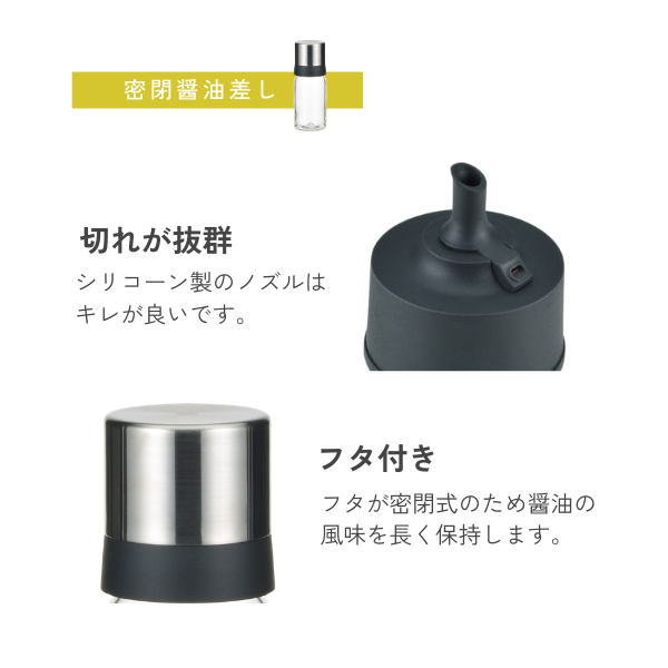 フタが密閉式のため醤油の風味を長く保持します。