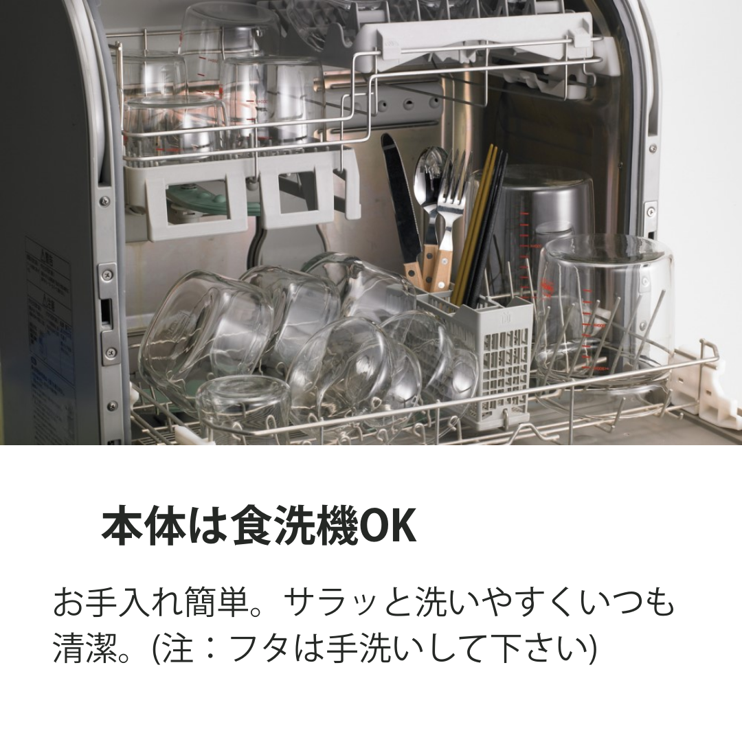 | 素材 | 本体/耐熱ガラス 注ぎ口/ポリプロピレン(耐熱温度:120℃) パッキン/シリコーンゴム(耐熱温度:200℃) フタ/AS樹脂(耐熱温度:90℃)  |