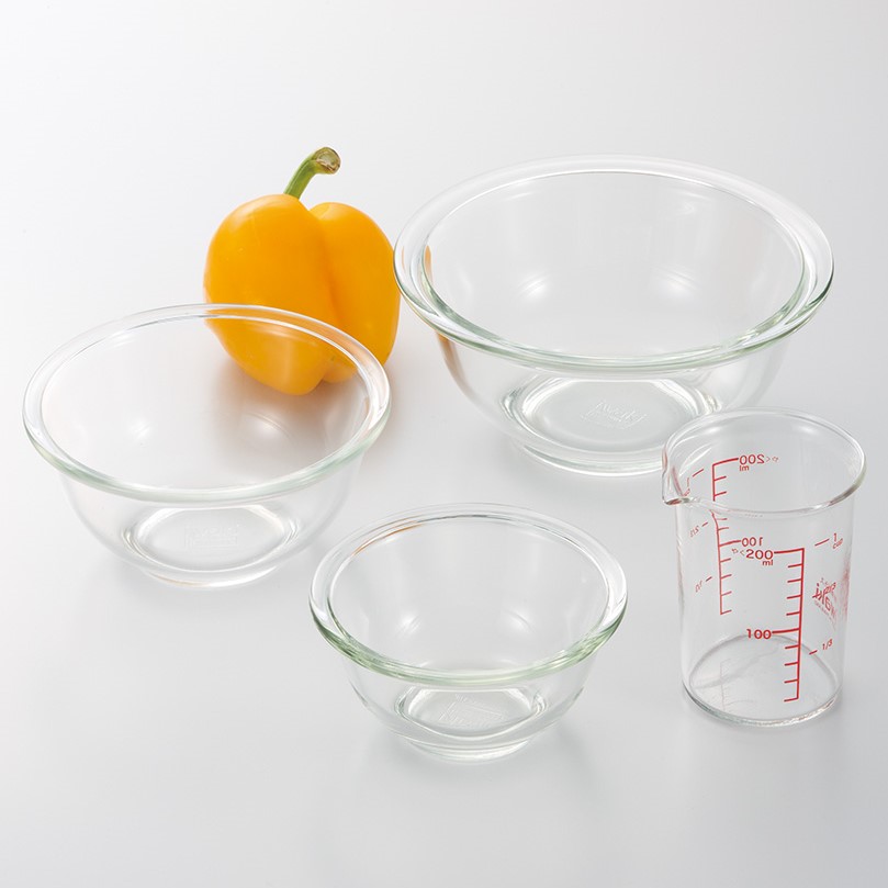 ボウル 250ml/φ11.6×H5.8cm ×1個 500ml/φ14.4×H6.8cm ×1個 900ml/φ18×H8cm ×1個 メジャーカップ 200ml/φ7.4×H10cm ×1個  |