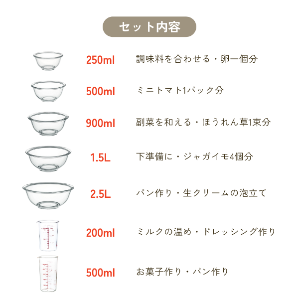 ボウル 250ml/φ11.6×H5.8cm ×1個 500ml/φ14.4×H6.8cm ×1個 900ml/φ18×H8cm ×1個 1.5L/φ21.3×H9cm ×1個 2.5L/φ25×H10.2cm ×1個 メジャーカップ 200ml/φ7.4×H10cm ×1個 500ml/φ9.1×H15.3cm ×1個 |