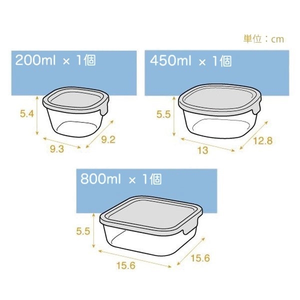 200ml/W9.3×D9.2×H5.4cm ×1個 450ml/W13×D12.8×H5.5cm ×1個 800ml/W15.6×D15.6×H5.5cm ×1個  |