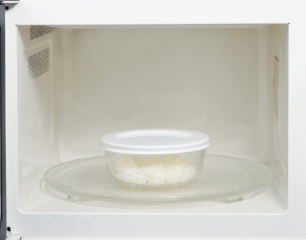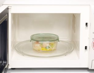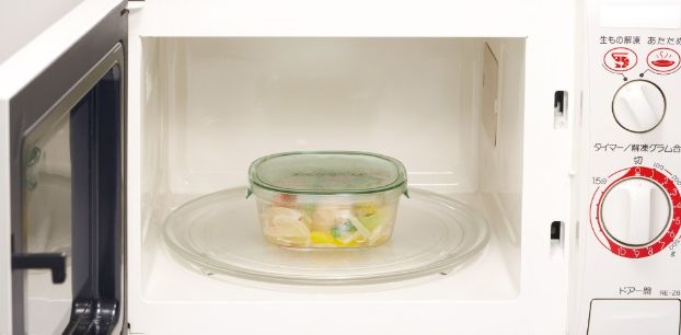 ガラスに表示されているレシピの位置まで材料を入れてレンジで加熱するだけで作れる!