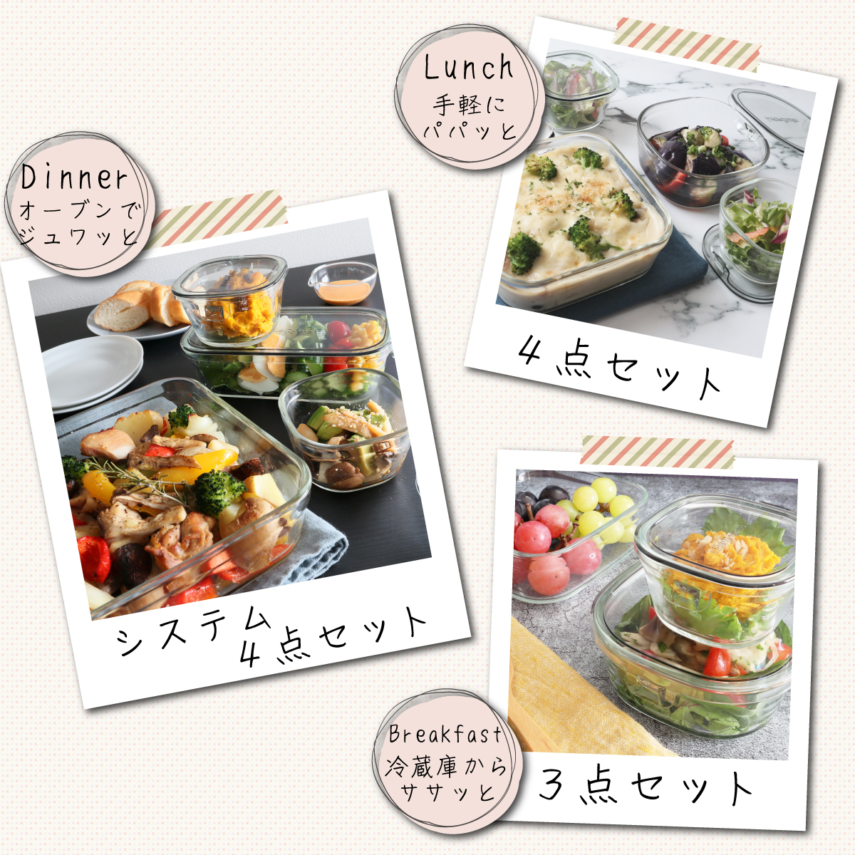 福神漬けや煮豆など、袋で買った商品がそのまま入る優れもの。冷蔵庫の中でスタッキングが得意です。毎日の朝食や小鉢として便利。ガラス本体は蒸し器やオーブンに入れられるので、プリンを作ってもとても可愛いです。→レシピはこちら(湯煎焼きプリン)