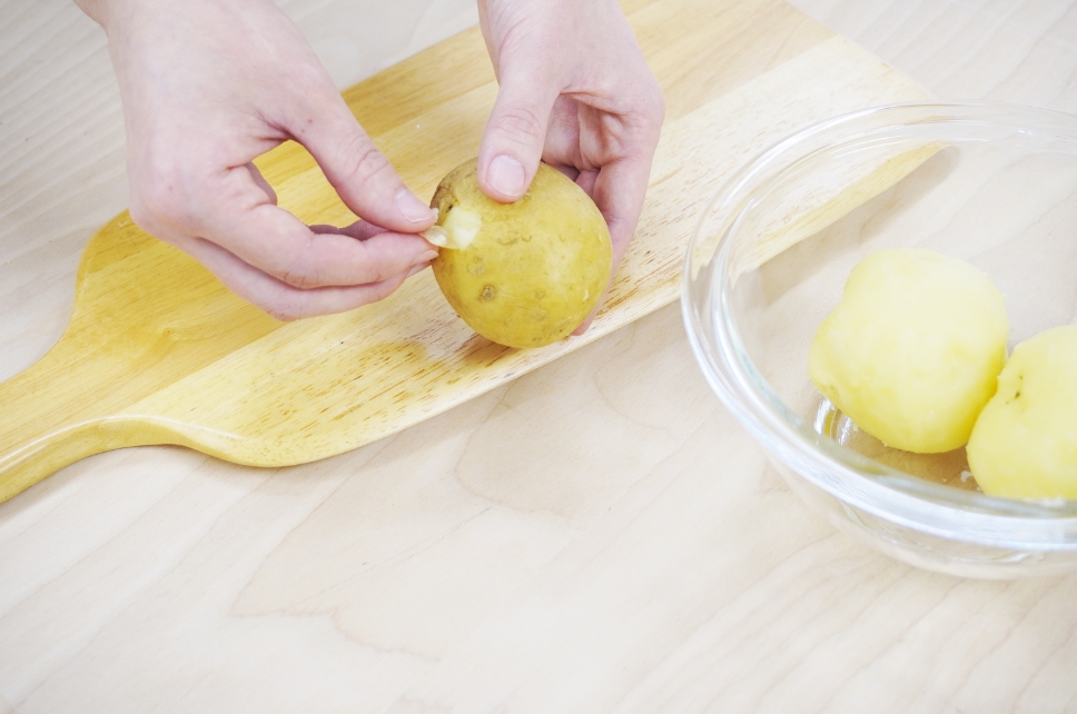 土を水で洗い落とし、皮が付いたままボウルに入れる。