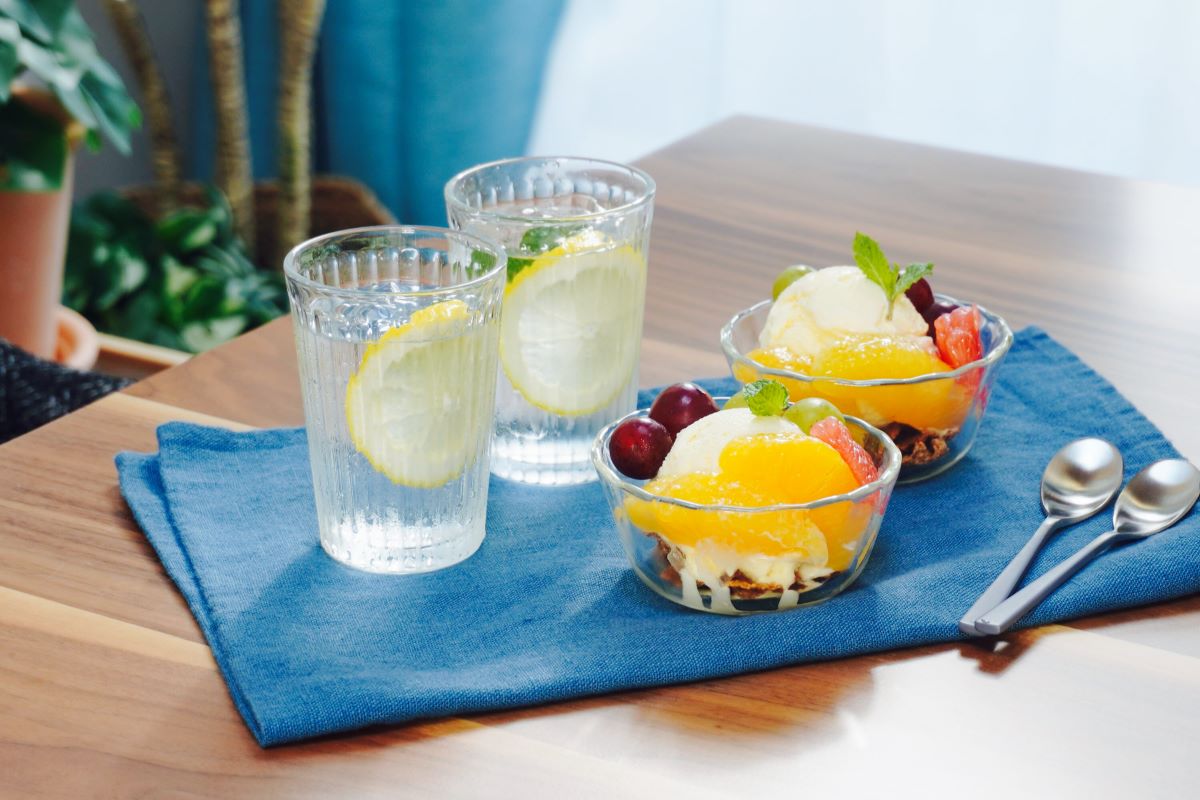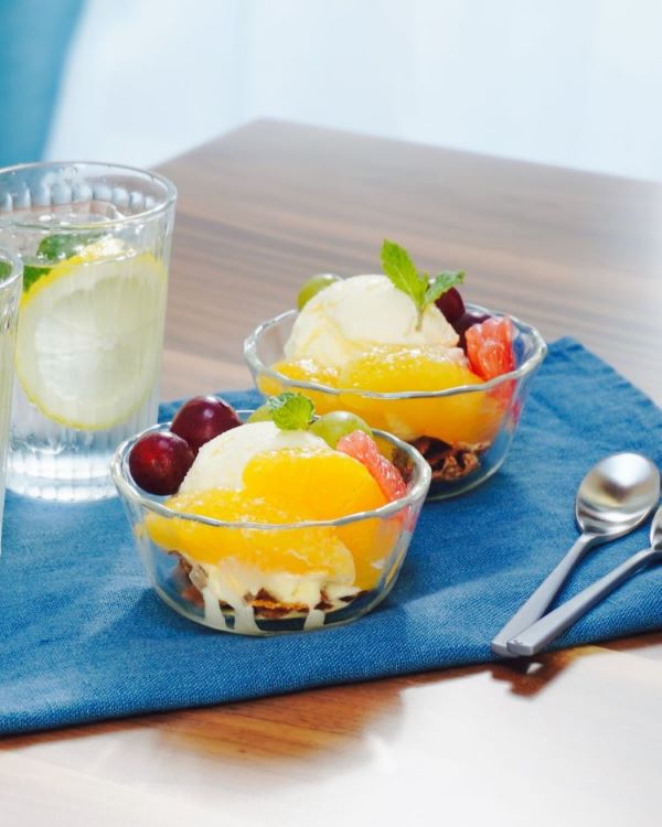 シリアルを敷いてアイスを乗せ、お好みの季節のフルーツをトッピングするだけで、フルーツサンデーの出来上がり。