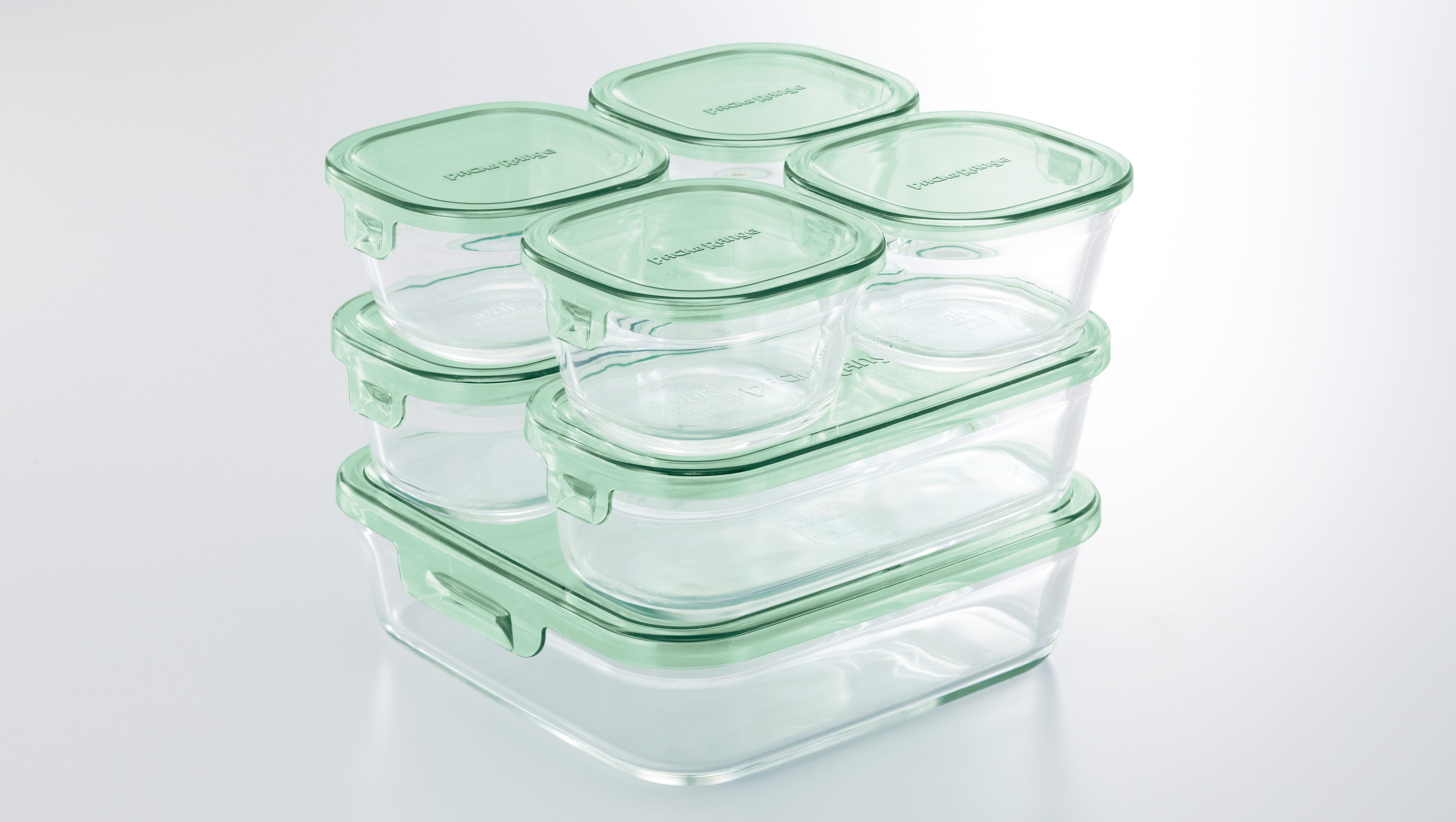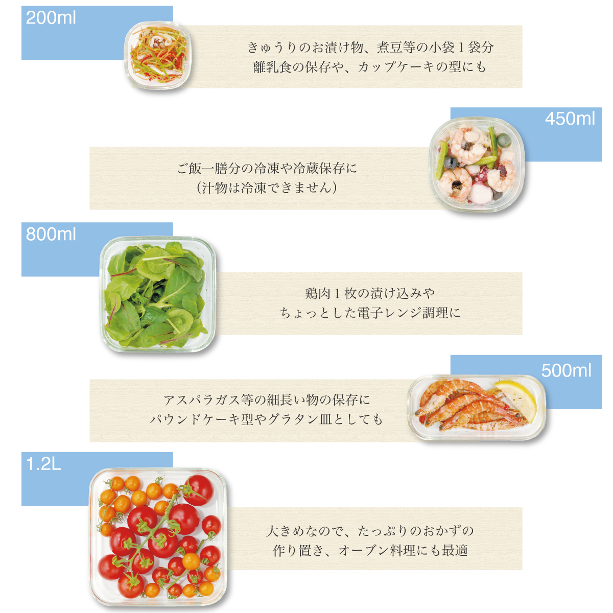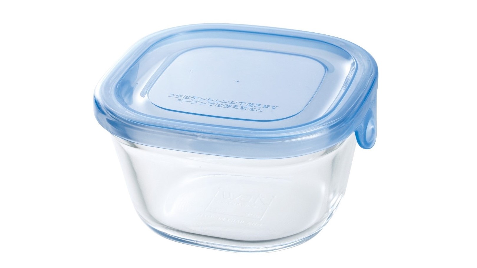 アクアブルー、乳白色(透け感があるホワイト)の蓋は、食洗機対応、ポリプロピレン素材。電子レンジ可能。