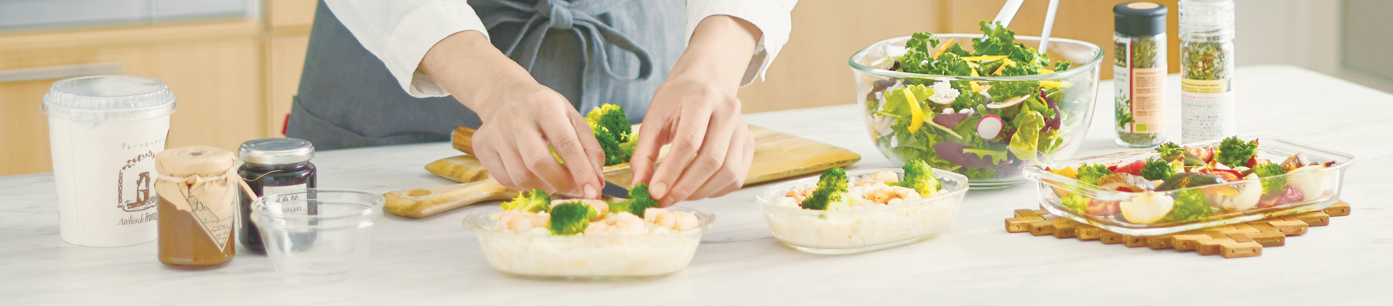 密閉性の蓋を活かし、丸型は旬の食材を漬けたり、角型の深さがある容器は汁気の多い料理に最適♪