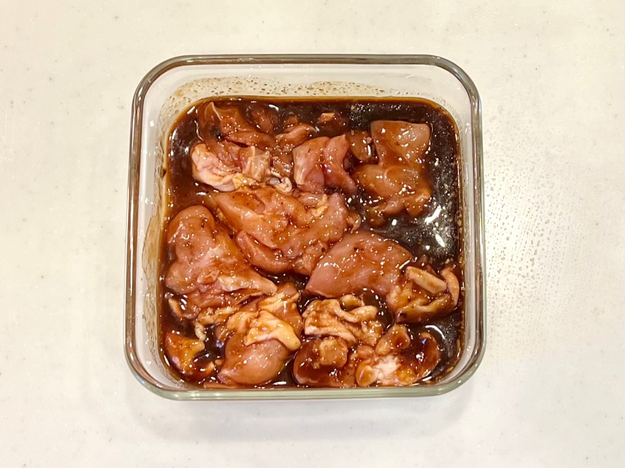 パック&レンジに鶏肉をいれ、【a】と和えて冷蔵庫で30分置く