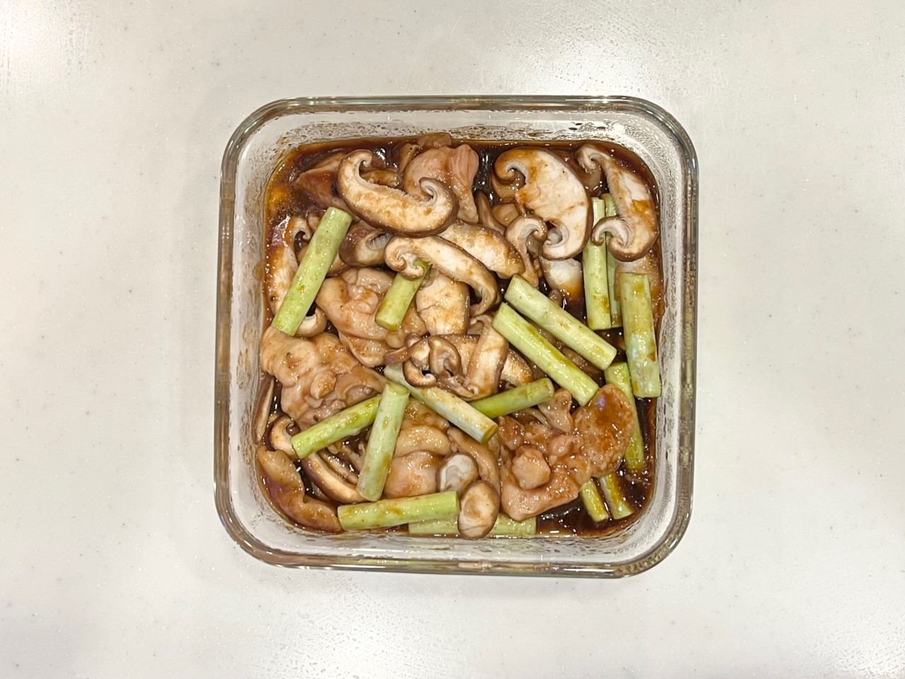 薄切りにしたシイタケ、アスパラの根元部分をのせ、更に3分加熱する