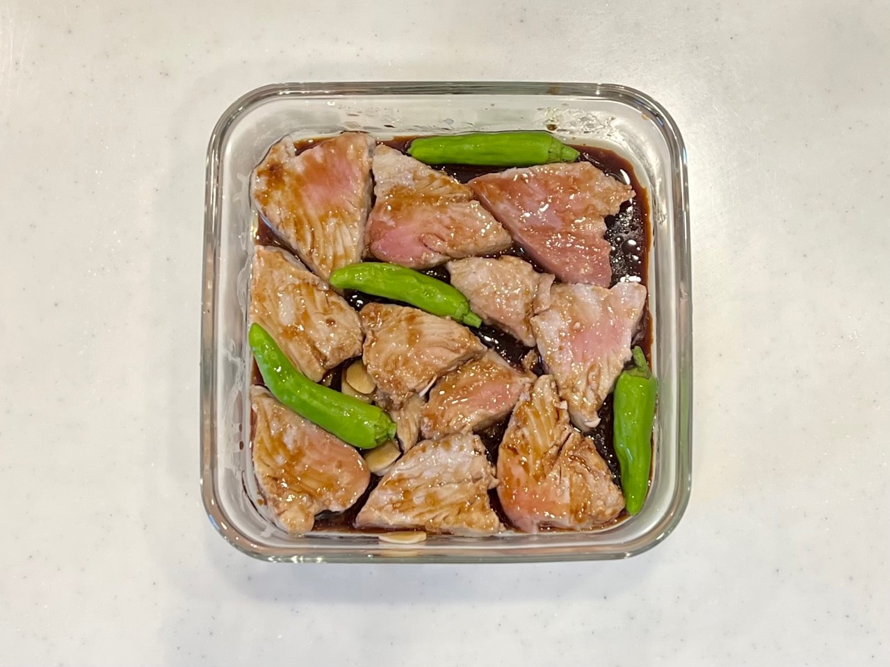 電子レンジから取り出し、ヨシダソースとスライスしたにんにくを絡め、カツオの間にししとうを置き、フタをせずに2分加熱する。