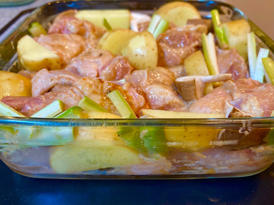 じゃがいもとアスパラの根に近い部分、シイタケを肉の隙間にぎゅうぎゅうに差し込み、余熱した220度のオーブンで25分焼く